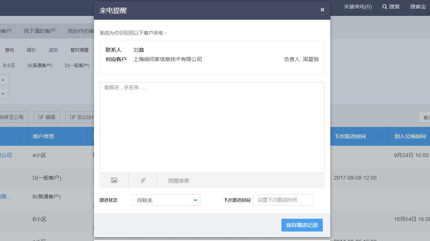 可同时在来电弹屏上写跟进,一边通话,一边记录与客户沟通的关键信息。
